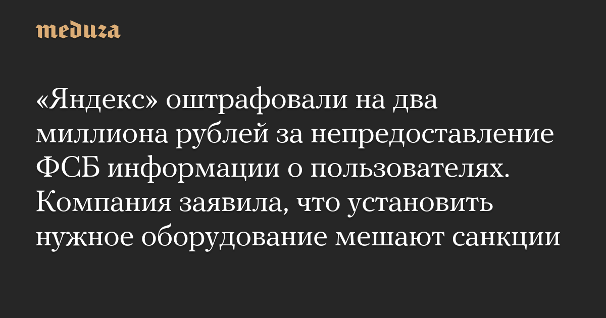«Яндекс» оштрафовали на два миллиона рублей за непредоставление ФСБ информации о пользователях. Компания заявила, что установить нужное оборудование мешают санкции