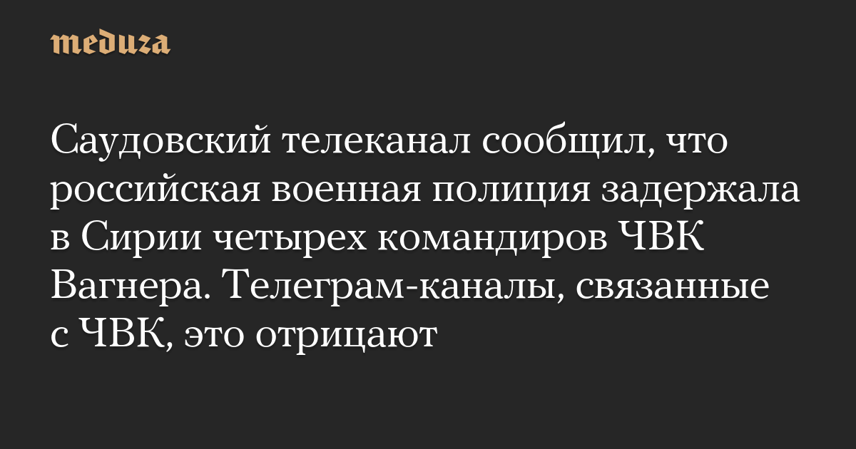 Саудовский телеканал сообщил, что российская военная полиция задержала в Сирии четырех командиров ЧВК Вагнера. Телеграм-каналы, связанные с ЧВК, это отрицают