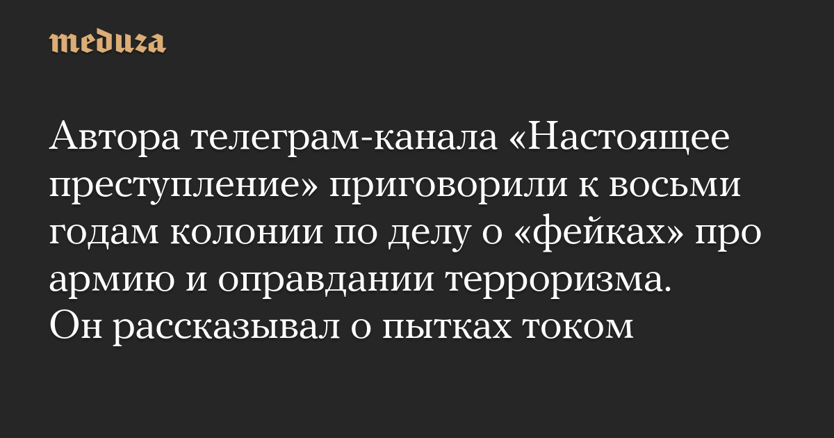 Автора телеграм-канала «Настоящее преступление» приговорили к восьми годам колонии по делу о «фейках» про армию и оправдании терроризма. Он рассказывал о пытках током