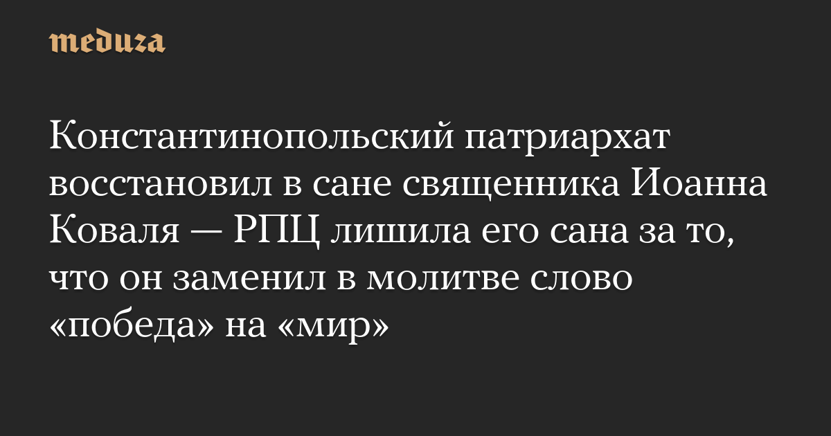 Константинопольский патриархат восстановил в сане московского священника Иоанна Коваля, которого Русская православная церковь лишила сана за то, что он заменил в молитве слово «победа» на «мир». На решение Константинопольского патриархата обратила внимание Sota.