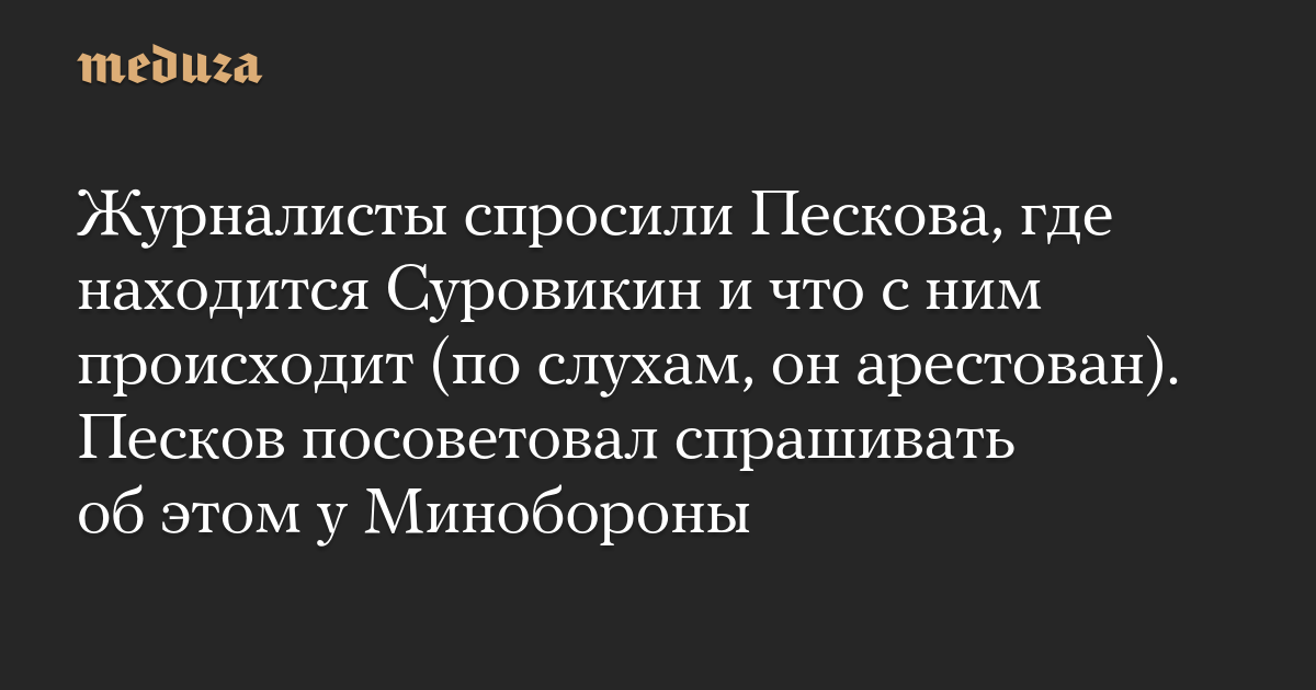 Журналисты спросили Пескова, где находится Суровикин и что с ним происходит (по слухам, он арестован). Песков посоветовал спрашивать об этом у Минобороны
