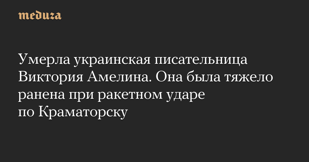 Украинская писательница Виктория Амелина умерла в возрасте 37 лет после того, как была ранена при ракетном ударе по Краматорску в конце июня. Об этом сообщает украинский ПЕН-клуб, в котором состояла писательница.