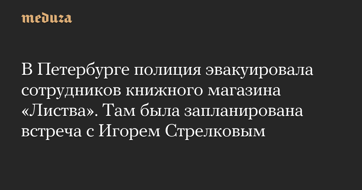 Сотрудники полиции Петербурга эвакуировали сотрудников книжного магазина «Листва», где вечером 9 июля должна была пройти встреча с Игорем Стрелковым (Гиркиным), сообщили в телеграм-канале магазина.