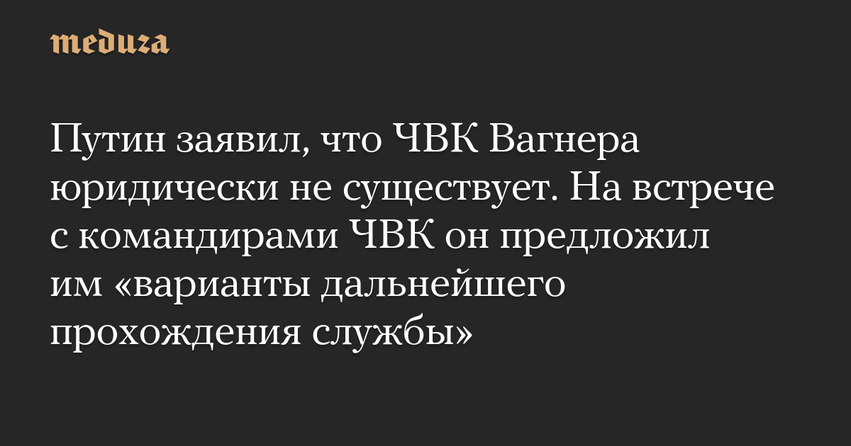 Путин заявил, что ЧВК Вагнера юридически не существует. На встрече с командирами ЧВК он предложил им «варианты дальнейшего прохождения службы»