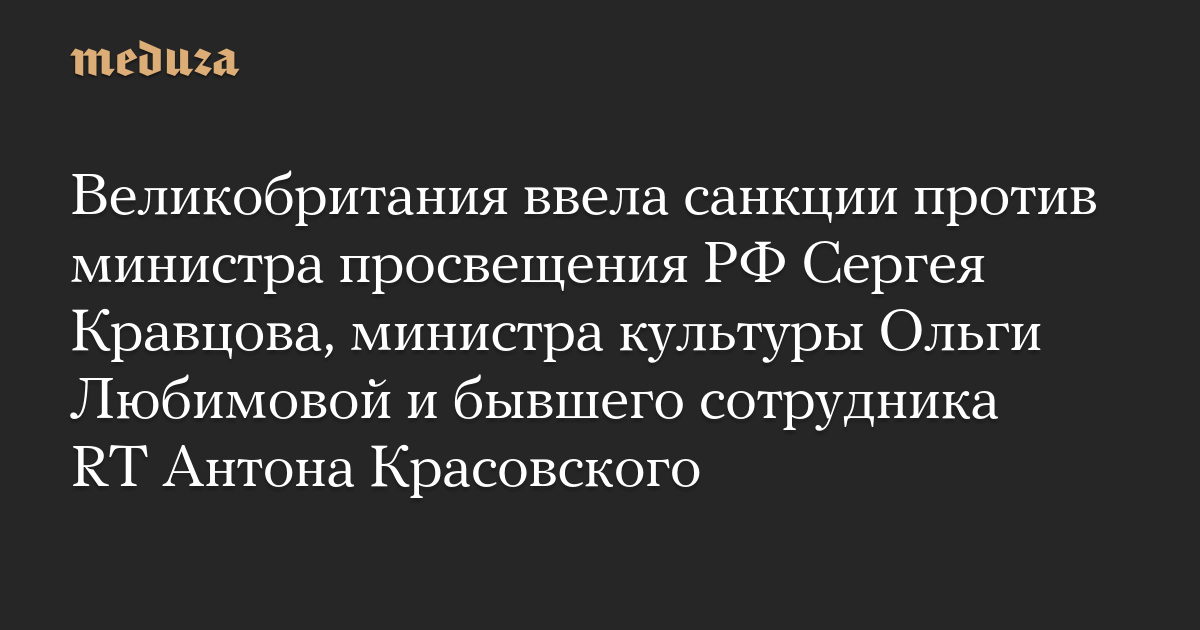 Великобритания ввела санкции против министра просвещения РФ Сергея Кравцова, министра культуры Ольги Любимовой и бывшего сотрудника RT Антона Красовского