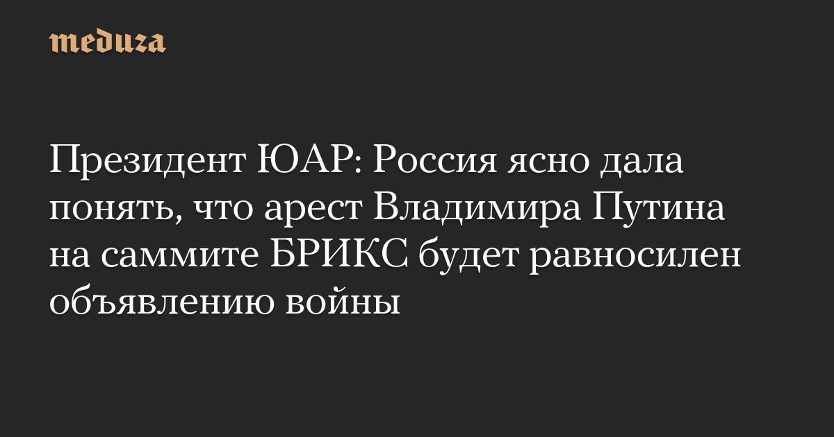 Президент ЮАР: Россия ясно дала понять, что арест Владимира Путина на саммите БРИКС будет равносилен объявлению войны