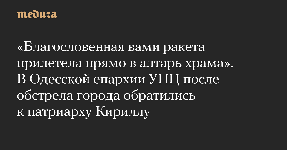 Сегодня, когда я приехал по окончанию комендантского часа в Спасо-Преображенский Одесский кафедральный собор, увидел, что «благословенная» Вами ракета рф прилетела прямо в алтарь храма в святая святых, я понял, что общего с Вашими пониманиями у Украинской Православной Церкви ничего уже давно нет. Из-за личных амбиций Вы потеряли Украинскую Православную Церковь и другие Церкви в странах «святой Руси»! (сохранена авторская орфография)