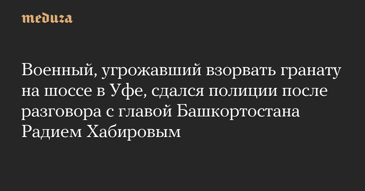 Российский военный, угрожавший взорвать гранату на шоссе в Уфе, сдался властям после разговора с главой Башкортостана Радием Хабировым, сообщает РБК-Уфа.