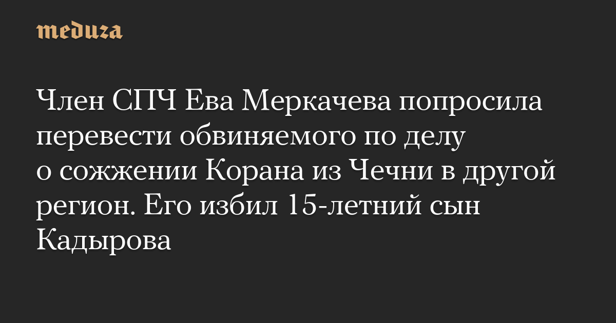 Член СПЧ Ева Меркачева попросила перевести обвиняемого по делу о сожжении Корана из Чечни в другой регион. Его избил 15-летний сын Кадырова