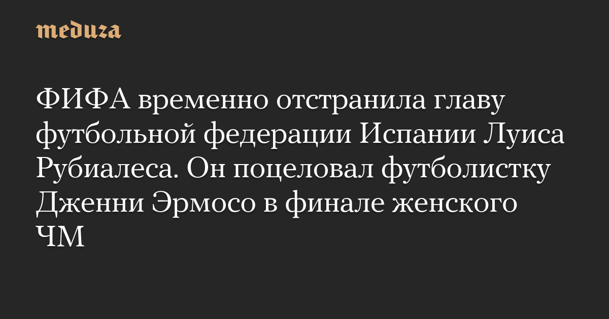 Президент Королевской испанской футбольной федерации Луис Рубиалес отстранен от любой футбольной деятельности на национальном и международном уровне на время дисциплинарного разбирательства, начатого из-за того, что он поцеловал футболистку сборной Испании Дженнифер Эрмосо. Срок отстранения — 90 дней, начиная с 26 августа, сообщается на сайте ФИФА.