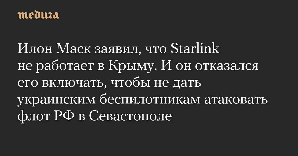 В посте, опубликованном в соцсети X (бывший Twitter, принадлежит Маску, — прим. «Медузы»), бизнесмен заявил, что не поручал отключать Starlink, так как, по его словам, в Крыму эта система и так не работает. По словам Маска, он отказал украинским военным в просьбе включить Starlink, чтобы обеспечить пролет дронов к Севастополю для атаки на российский флот.
