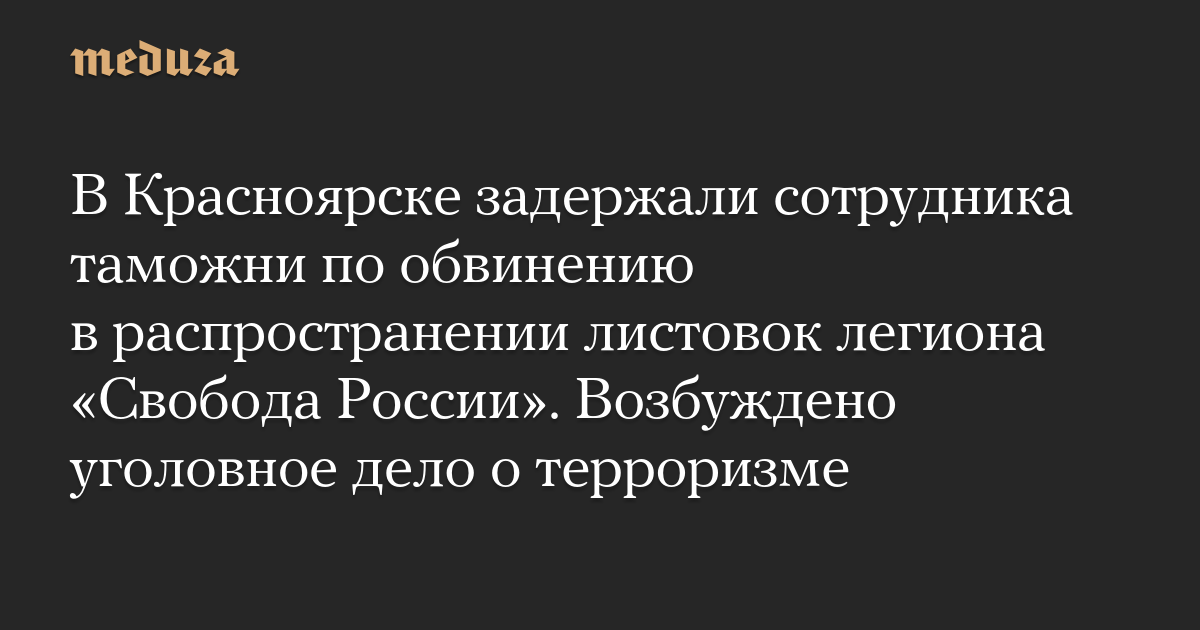 В Красноярске задержали сотрудника таможни по обвинению в распространении листовок легиона «Свобода России». Возбуждено уголовное дело о терроризме