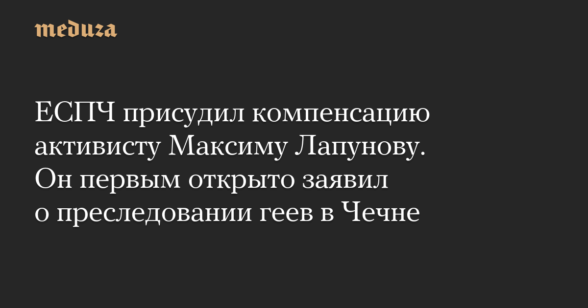 Европейский суд по правам человека (ЕСПЧ) присудил 52 тысячи евро Максиму Лапунову, который первым открыто заявил о преследовании ЛГБТ-людей в Чечне. Суд подтвердил нарушение статей о незаконном лишении свободы и о пытках из-за сексуальной ориентации, сообщает The Insider.