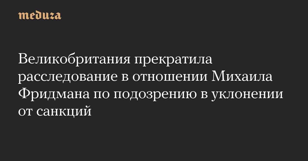 Национальное агентство по борьбе с преступностью (NCA) Великобритании прекратило расследование в отношении российского миллиардера Михаила Фридмана, которого подозревали в уклонении от санкций. Об этом сообщает Bloomberg, ссылаясь на представителя NCA.