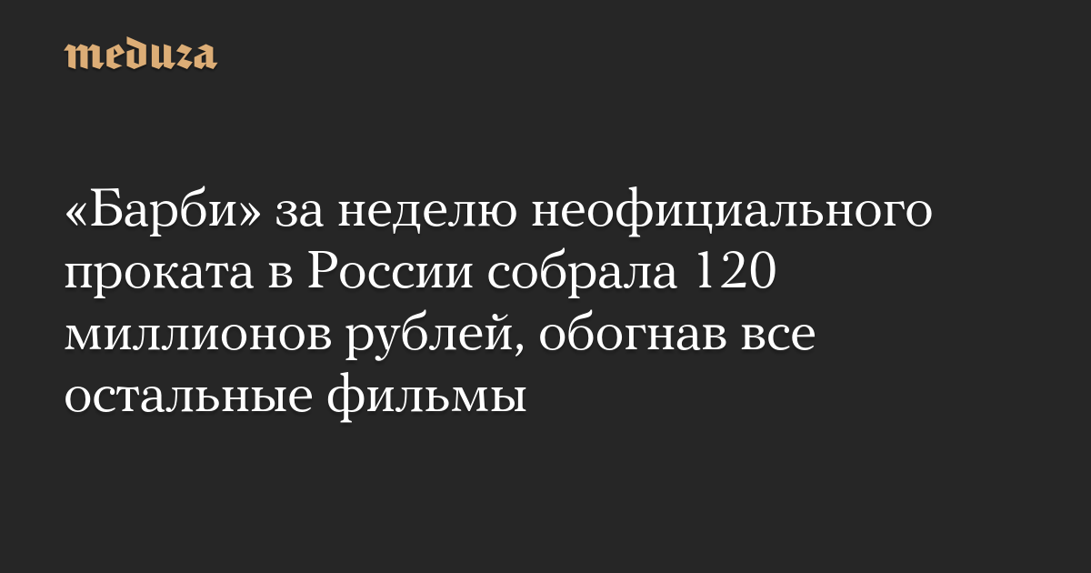 Фильм Греты Гервиг «Барби», который начали неофициально показывать в российских кинотеатрах, собрал в первую неделю проката около 120 миллионов рублей. Как отмечает «Бюллетень кинопрокатчика», далеко не все сеансы фильма можно посчитать, поэтому сборы «Барби» могут быть гораздо больше.