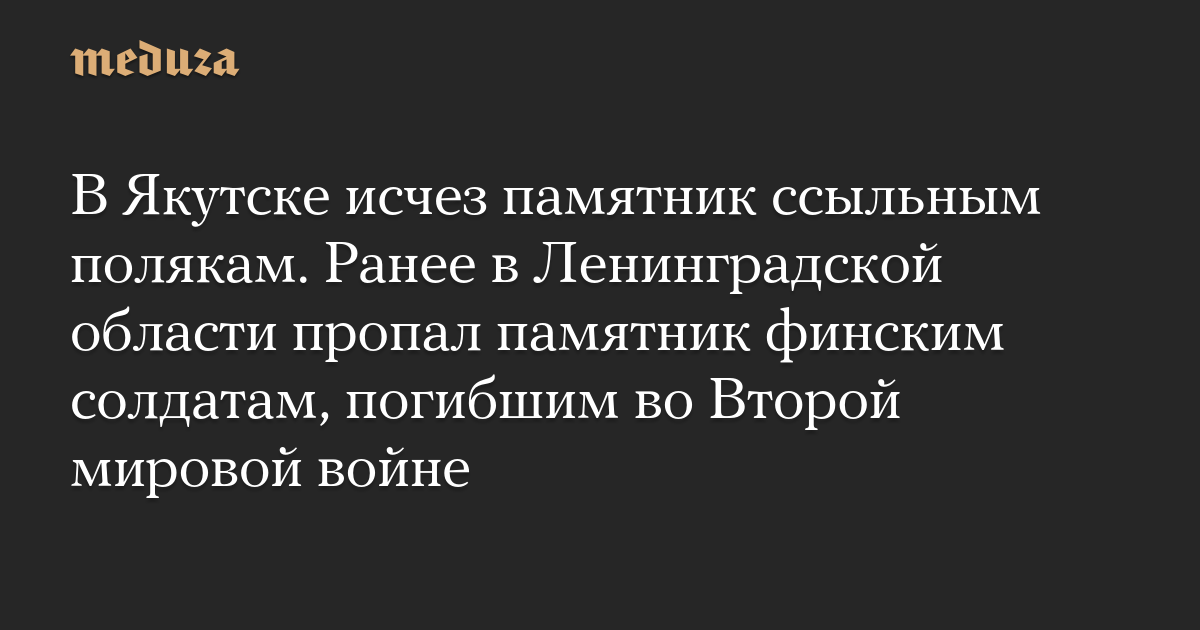 В Якутске исчез памятник ссыльным полякам. Ранее в Ленинградской области пропал памятник финским солдатам, погибшим во Второй мировой войне