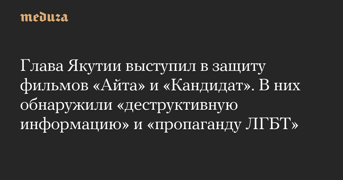Глава Якутии выступил в защиту фильмов «Айта» и «Кандидат». В них обнаружили «деструктивную информацию» и «пропаганду ЛГБТ»