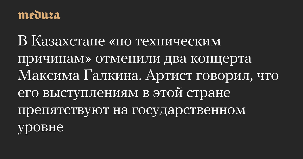 Выступления шоумена Максима Галкина в Казахстане вновь отменены, пишет «Новая газета Европа». 8 октября артист должен был дать концерт в Центральном концертном зале «Казахстан» в Астане. Однако 30 сентября руководство ЦКЗ объявило, что на площадке 4-10 октября будут проведены технические работы на сетях водопровода и концерт, соответственно, отменяется.