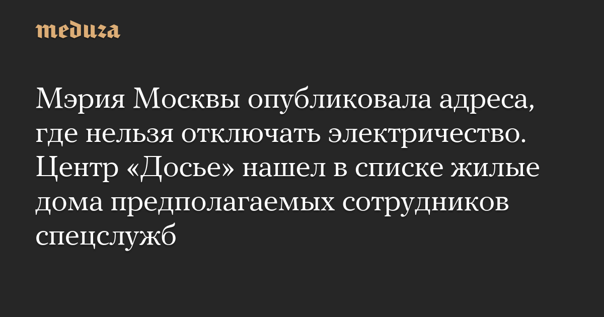 Мэрия Москвы опубликовала адреса, где нельзя отключать электричество. Центр «Досье» нашел в списке жилые дома предполагаемых сотрудников спецслужб