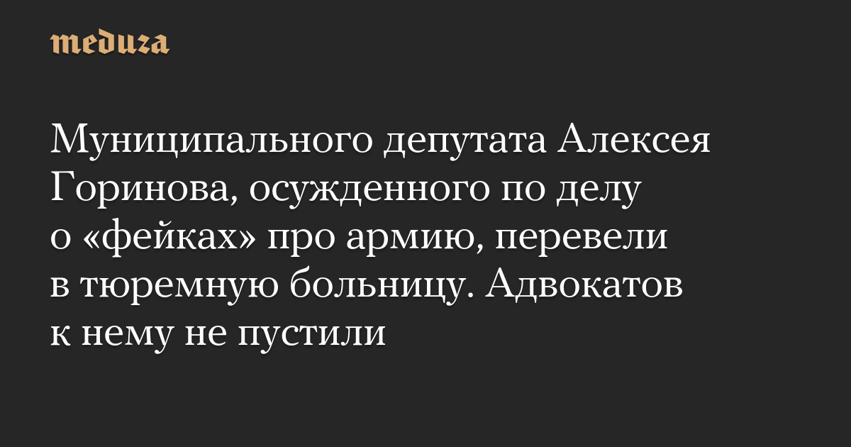 Московского муниципального депутата Алексея Горинова, осужденного по делу о «фейках» про российскую армию, перевели в тюремную больницу. Об этом сообщает «Новая газета» со ссылкой на его защитников Катерину Тертухину и Светлану Давыдову.