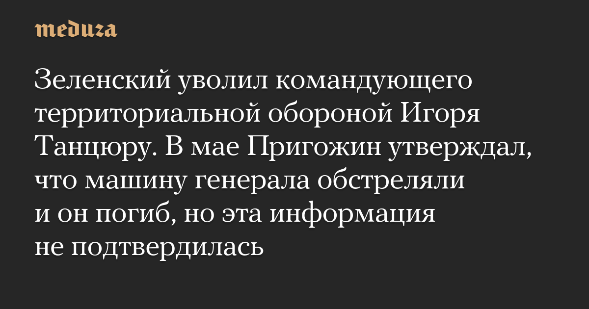Зеленский уволил командующего территориальной обороной Игоря Танцюру. В мае Пригожин утверждал, что машину генерала обстреляли и он погиб, но эта информация не подтвердилась