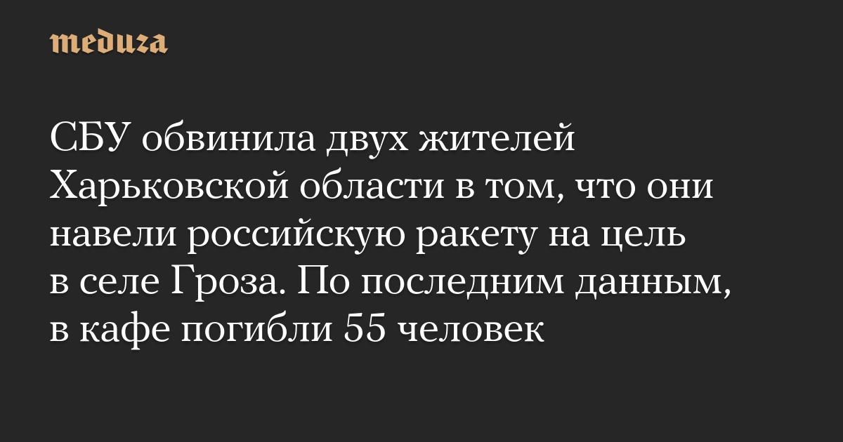 СБУ обвинила двух жителей Харьковской области в том, что они навели российскую ракету на цель в селе Гроза. По последним данным, в кафе погибли 55 человек
