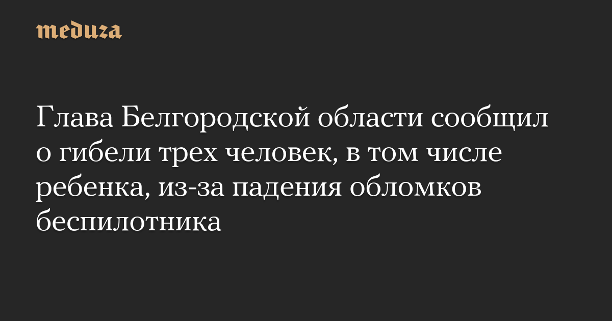 Глава Белгородской области сообщил о гибели трех человек, в том числе ребенка, из-за падения обломков беспилотника