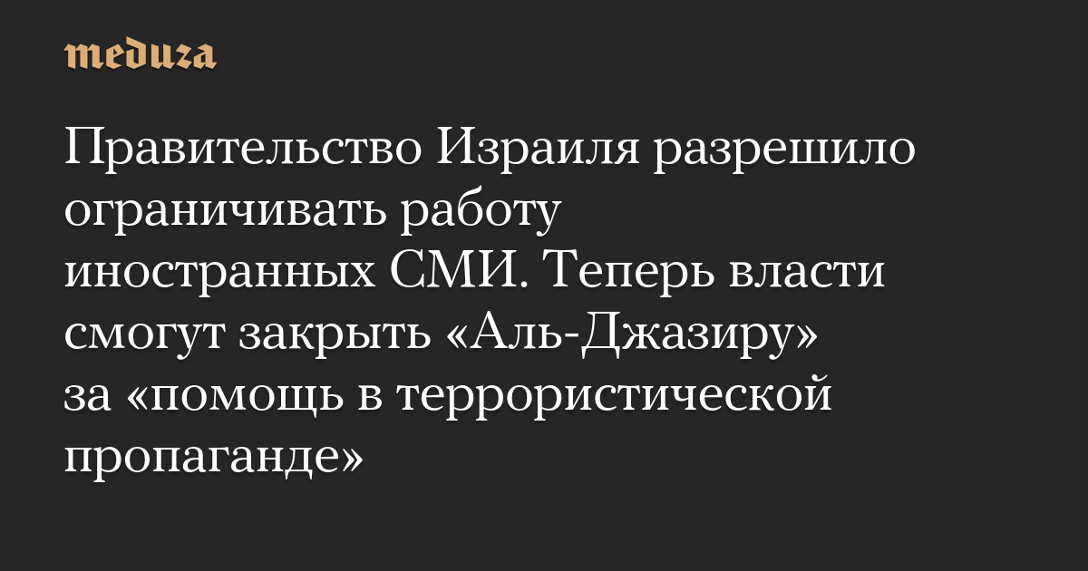 Правительство Израиля разрешило ограничивать работу иностранных СМИ. Теперь власти смогут закрыть «Аль-Джазиру» за «помощь в террористической пропаганде»