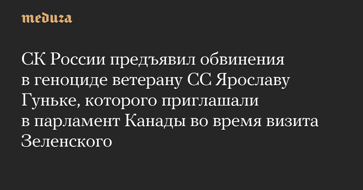 Главное следственное управление СК России заочно предъявило обвинение ветерану дивизии СС «Галичина» Ярославу Гуньке, которого приглашали на заседание канадского парламента во время визита Владимира Зеленского.
