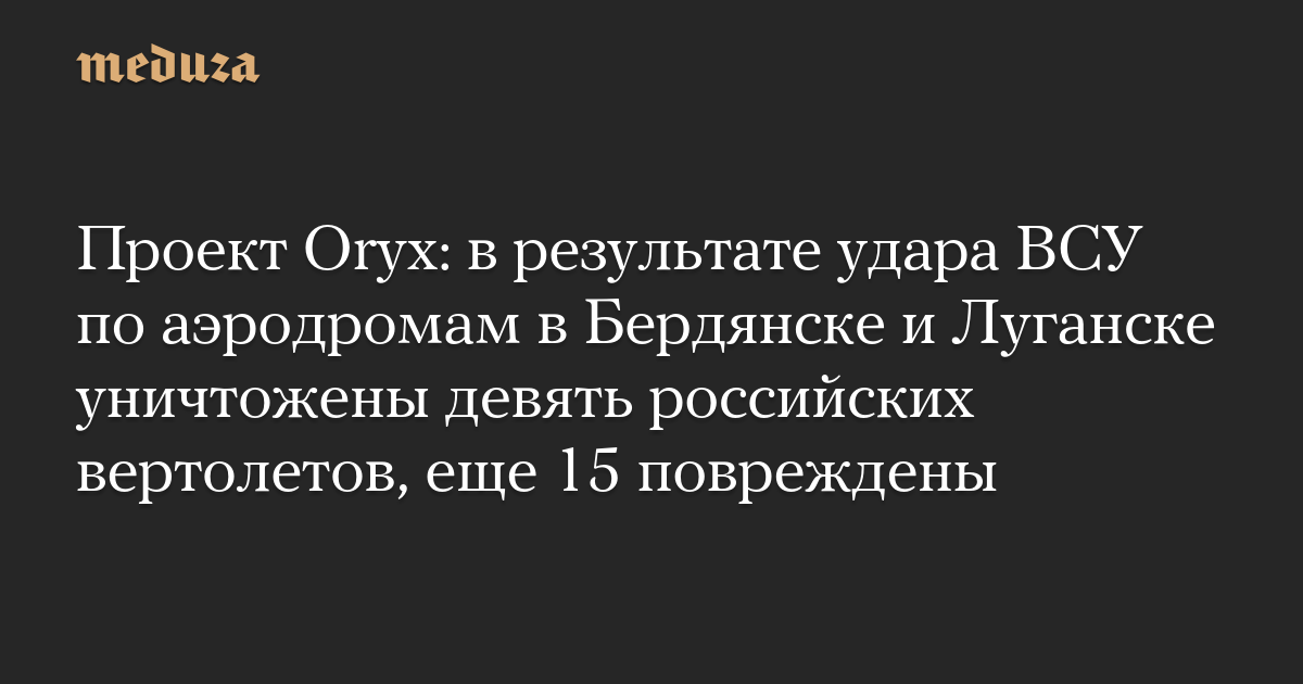 Проект Oryx, отслеживающий, в числе прочего, потери техники российскими войсками в Украине, пришел в выводу, что в результате ударов по аэродромам в Бердянске и Луганске, которые используют войска РФ, были уничтожены девять вертолетов — семь Ка-52 и два Ми-8.