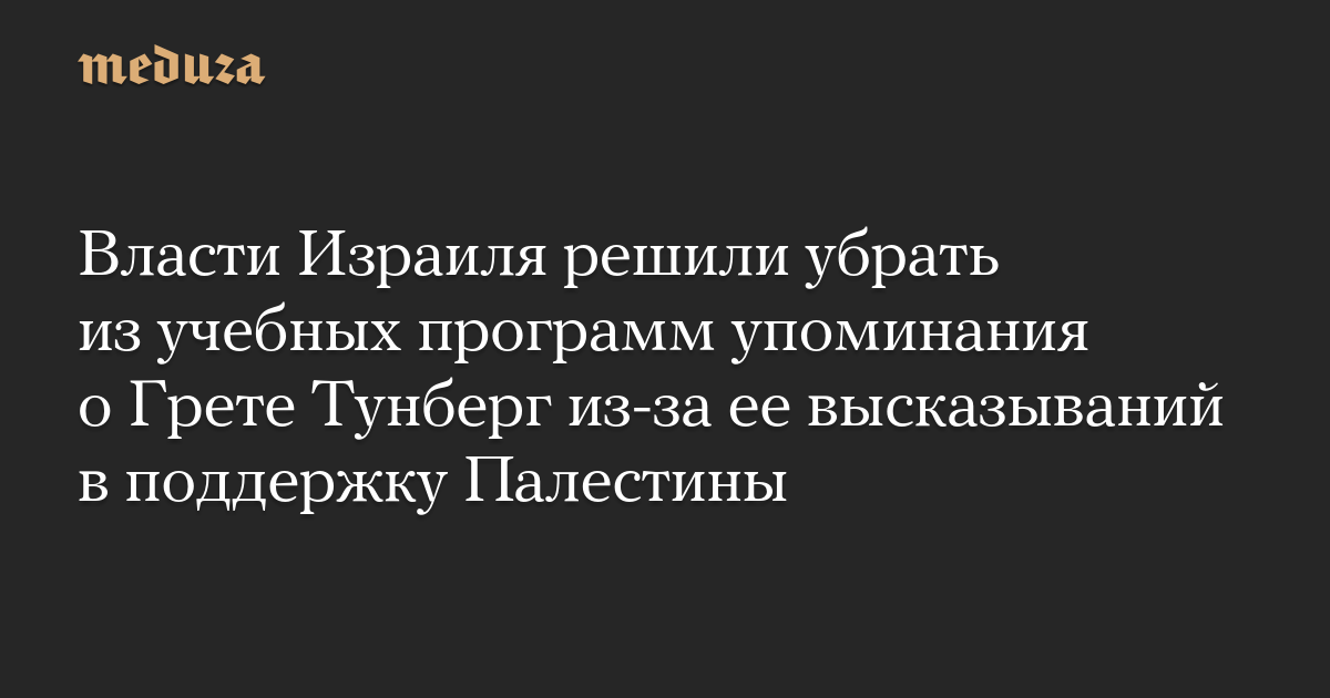 Министерство образования Израиля объявило, что уберет из учебных программ любые упоминания шведской активистки Греты Тунберг из-за ее высказываний в поддержку Палестины, сообщают Jerusalem Post и The Times of Israel.
