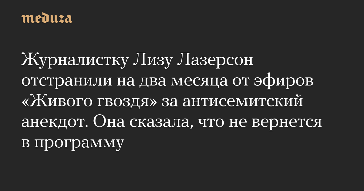Журналистку Лизу Лазерсон отстранили на два месяца от эфиров «Живого гвоздя» за антисемитский анекдот. Она сказала, что не вернется в программу