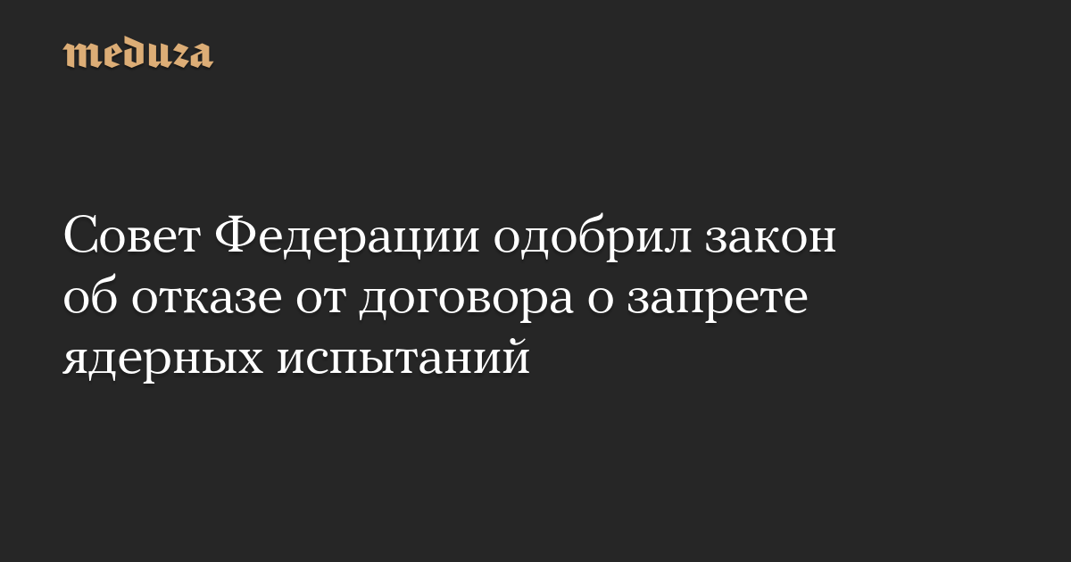 Совет Федерации одобрил закон об отзыве ратификации Договора о всеобъемлющем запрещении ядерных испытаний. Об этом сообщает «Интерфакс».