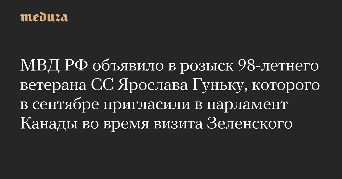 Министерство внутренних дел России объявило в федеральный розыск 98-летнего ветерана СС Ярослава Гуньку, которого в сентябре пригласили в парламент Канады во время визита президента Украины Владимира Зеленского. Внимание на карточку в базе МВД обратила «Медиазона».