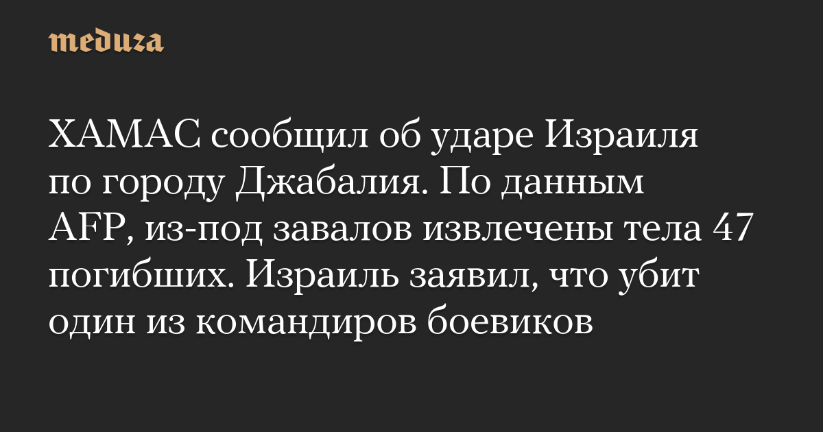 ХАМАС сообщил об ударе Израиля по городу Джабалия. По данным AFP, из-под завалов извлечены тела 47 погибших. Израиль заявил, что убит один из командиров боевиков