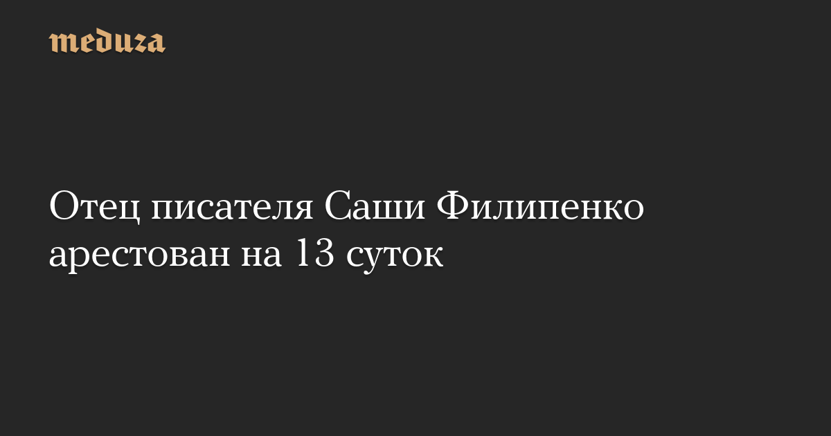 Отец белорусского писателя Саши Филипенко арестован на 13 суток. Повод для ареста — «перепост какой-то статьи „Зеркала“», написал Филипенко в своем фейсбуке, добавив, что его «мама передает всем большое спасибо за слова поддержки».
