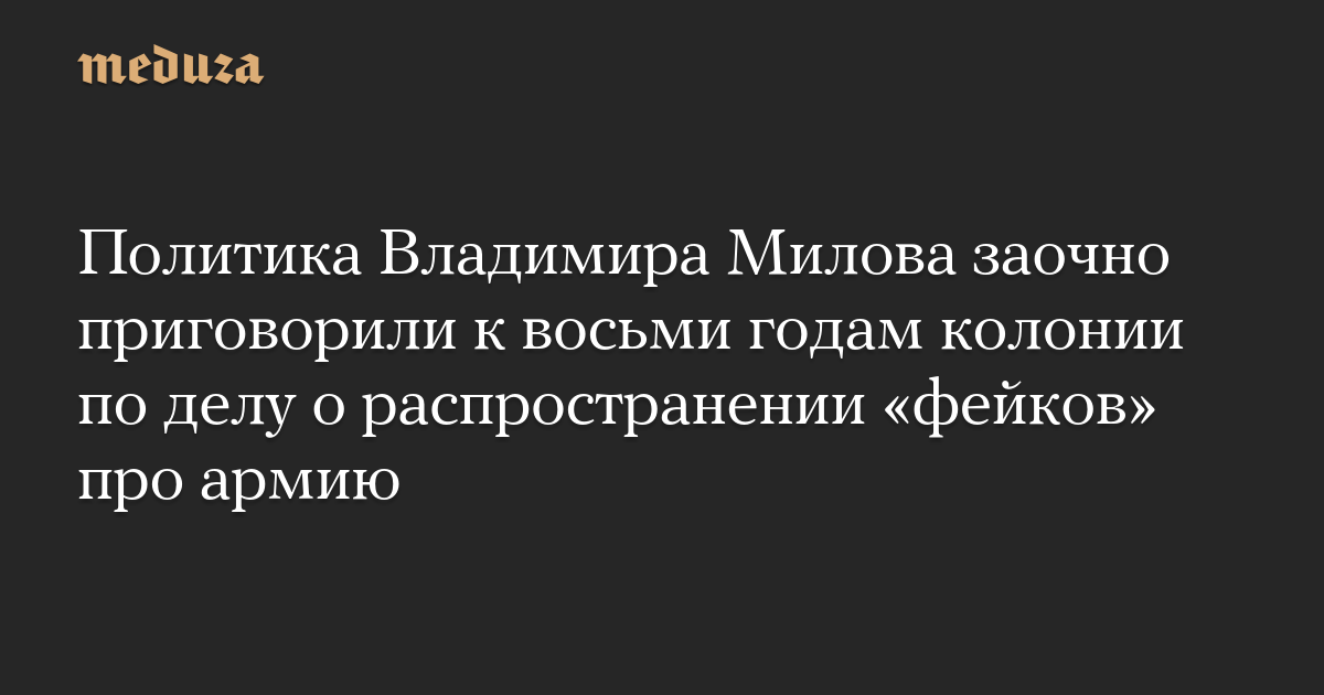 Басманный суд Москвы заочно приговорил соратника Алексея Навального, политика Владимира Милова к восьми годам колонии общего режима по обвинению в распространении «фейков» о российской армии по мотивам политической ненависти, сообщает «Медиазона».