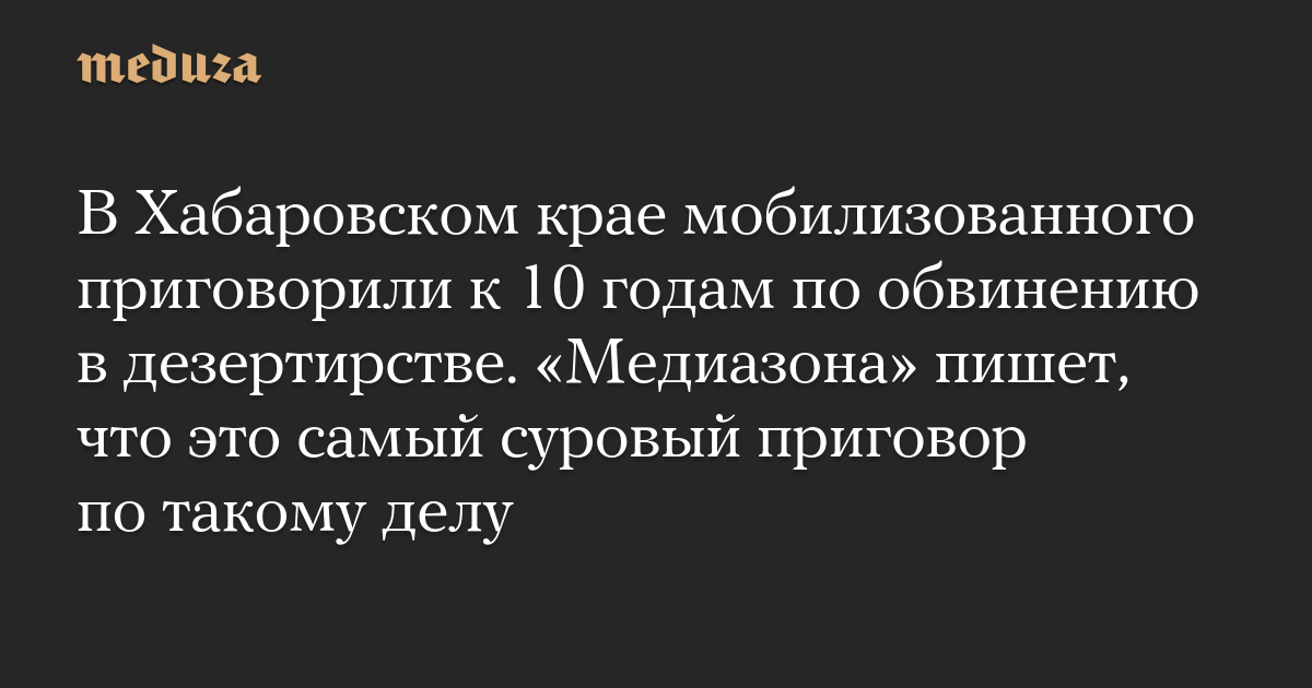 В Хабаровском крае мобилизованного приговорили к 10 годам по обвинению в дезертирстве. «Медиазона» пишет, что это самый суровый приговор по такому делу