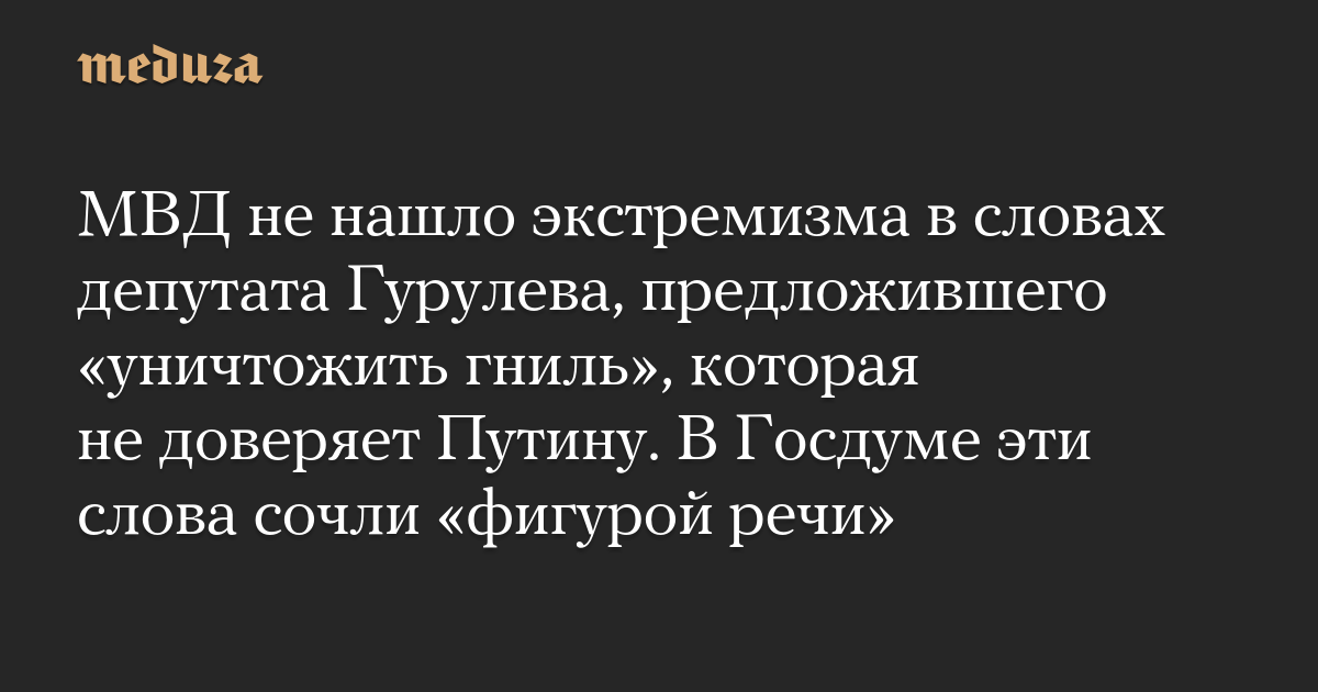 МВД не нашло экстремизма в словах депутата Гурулева, предложившего «уничтожить гниль», которая не доверяет Путину. В Госдуме эти слова сочли «фигурой речи»