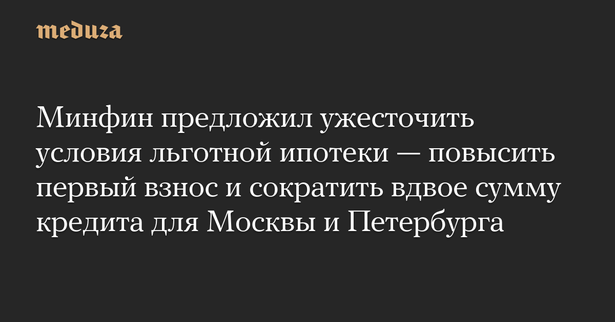 Минфин внес в правительство проект постановления об ужесточении условий льготной ипотеки, пишет «Интерфакс» со ссылкой на источник в финансово-экономическом блоке правительства. Проект призван «охладить» рынок жилищного кредитования, а среди основных предложений — повышение первоначального взноса и снижение суммы кредита для Москвы, Подмосковья и Санкт-Петербурга.