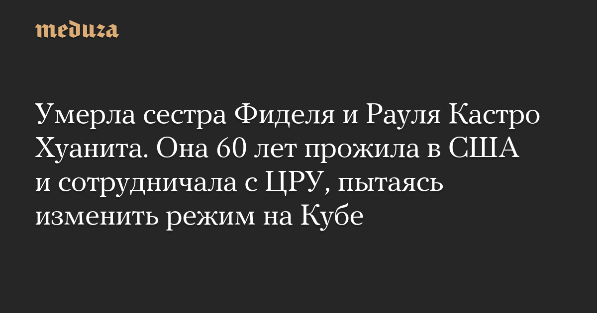Хуанита Кастро — сестра кубинских лидеров Фиделя и Рауля Кастро — умерла в возрасте 90 лет в Майами, штат Флорида, пишет «Голос Америки».