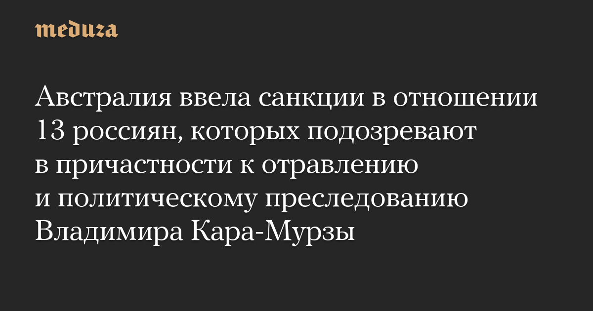 Власти Австралии ввели санкции в отношении 13 россиян, в том числе трех предполагаемых сотрудников ФСБ РФ, причастных, как утверждается, к отравлению и политическому преследованию политика и журналиста Владимира Кара-Мурзы, сообщает пресс-служба австралийского МИД.