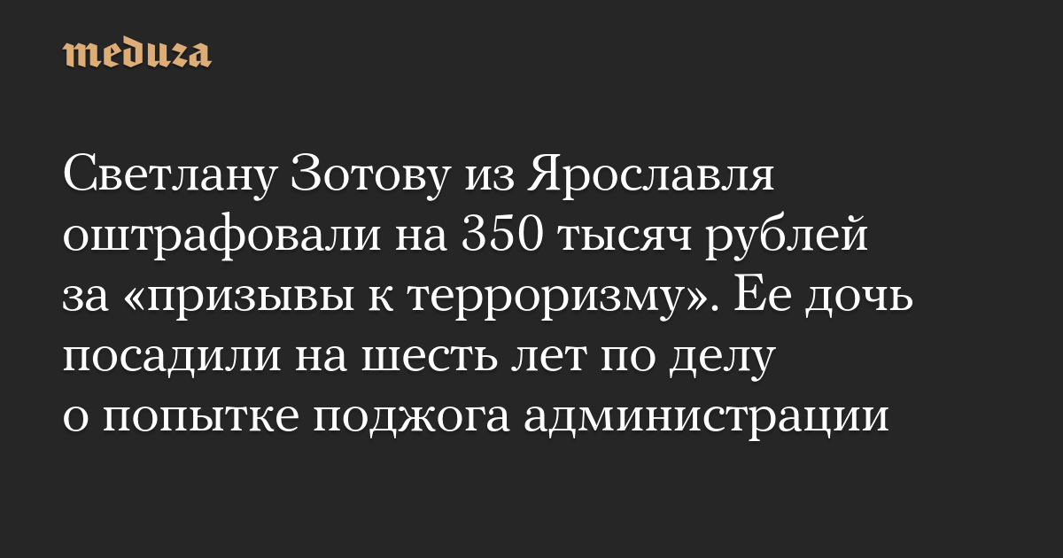 Светлану Зотову из Ярославля оштрафовали на 350 тысяч рублей за «призывы к терроризму». Ее дочь посадили на шесть лет по делу о попытке поджога администрации
