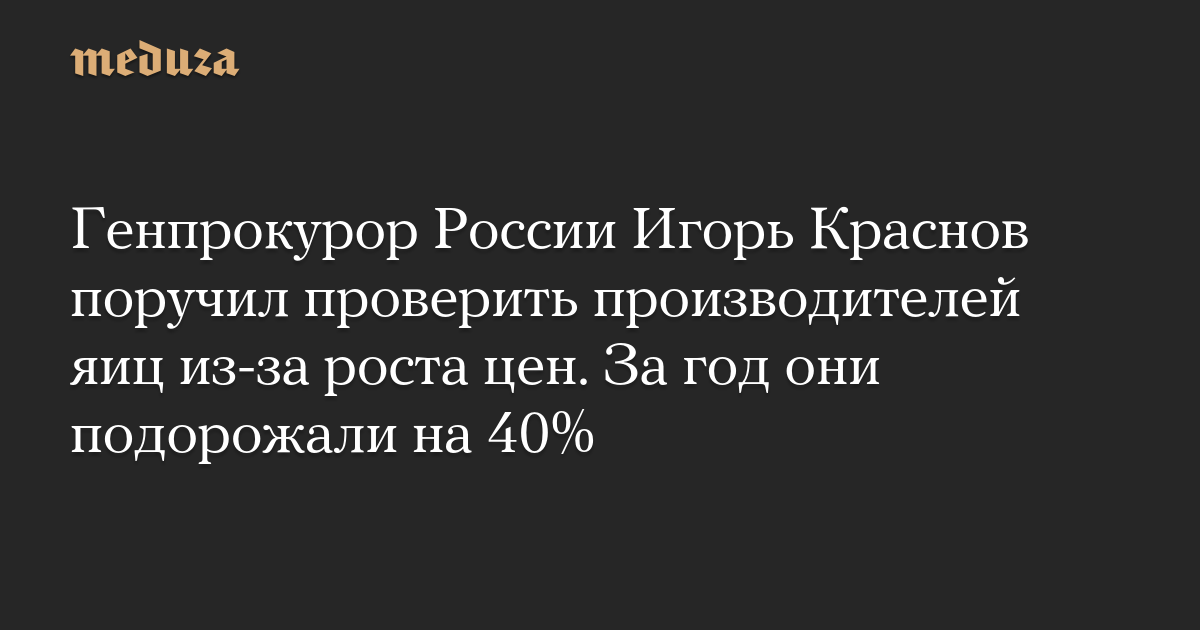 Генеральный прокурор Игорь Краснов поручил региональным прокуратурам проверить производителей куриных яиц и розничных продавцов из-за роста цен, сообщает пресс-служба ведомства.