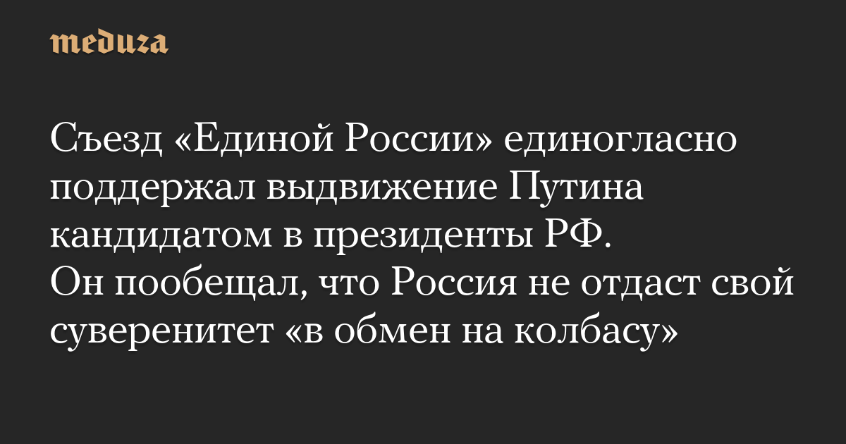 Съезд «Единой России» единогласно поддержал выдвижение Путина кандидатом в президенты РФ. Он пообещал, что Россия не отдаст свой суверенитет «в обмен на колбасу»