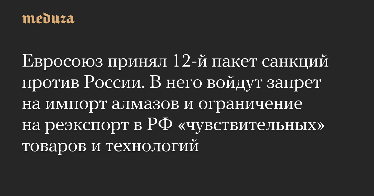 Евросоюз принял 12-й пакет санкций против России. В него войдут запрет на импорт алмазов и ограничение на реэкспорт в РФ «чувствительных» товаров и технологий