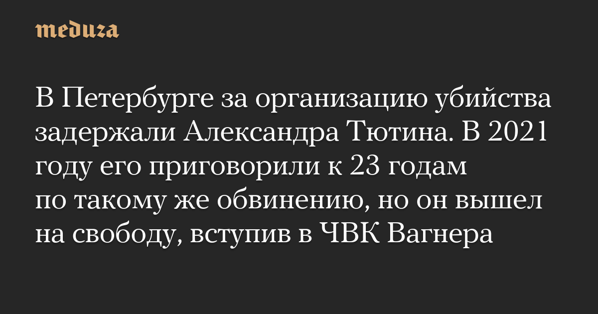 В Петербурге за организацию убийства задержали Александра Тютина. В 2021 году его приговорили к 23 годам по такому же обвинению, но он вышел на свободу, вступив в ЧВК Вагнера