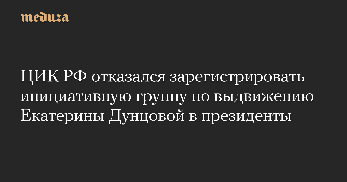 Центральная избирательная комиссия РФ отказалась зарегистрировать инициативную группу по выдвижению журналистки Екатерины Дунцовой в президенты. Сообщение об этом появилось в телеграм-канале Ateo Breaking, который ведет доверенное лицо Дунцовой. Таким образом, ЦИК не допустил Дунцову до сбора подписей, необходимых для выдвижения.