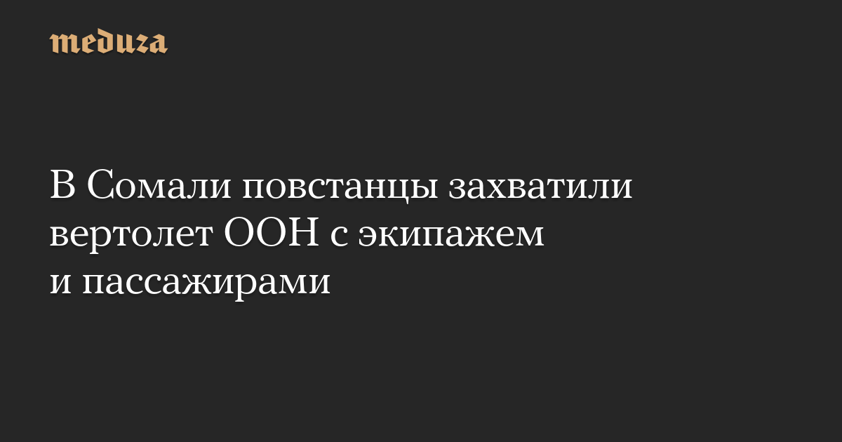 В Сомали члены исламистской группировки «Аш-Шабаб» захватили вертолет Организации Объединенных Наций, на борту которого находились несколько иностранцев. Об этом Reuters сообщил местный военный чиновник. Министр безопасности региона Галмудуг Мохамед Абди Адан подтвердил BBC News захват вертолета.