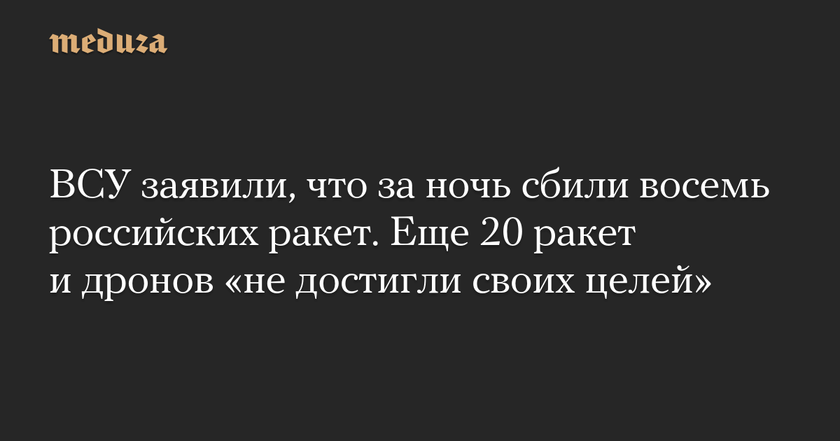 ВСУ заявили, что за ночь сбили восемь российских ракет. Еще 20 ракет и дронов «не достигли своих целей»